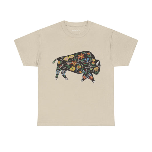 Unisex Heavy Cotton Tee, Native Beaded Floral Bison Design