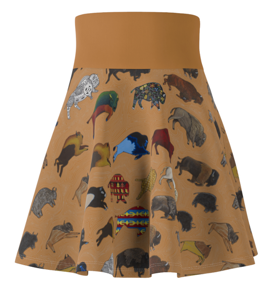 Tan Native Bison Pattern Skater Skirt — Cute Colorful Bison Print AOP