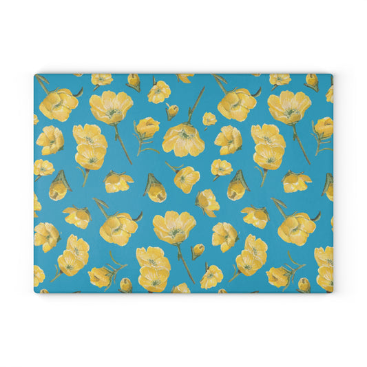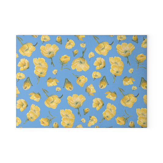 Glass Cutting Board, Kitchen Accessory, Buttercups, Light Blue Background, Oklahoma Wildflower, Yellow Floral