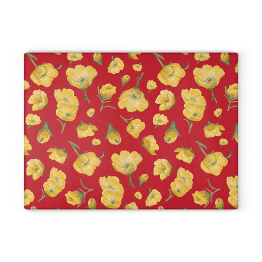 Glass Cutting Board, Kitchen Accessory, Buttercups, Red Background, Oklahoma Wildflower, Yellow Floral