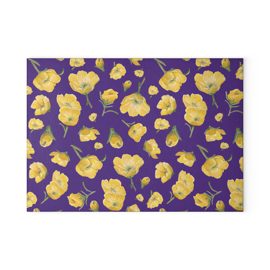 Glass Cutting Board, Kitchen Accessory, Buttercups, Purple Background, Oklahoma Wildflower, Yellow Floral
