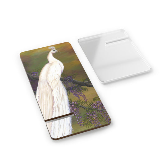 Mobile Display Stand for Smartphones, White Peacock on Purple Wisteria,