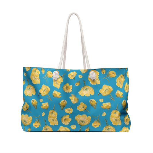 Weekender Bag, Buttercups, Turquoise Colored Background, Oklahoma Wildflower, Yellow Floral