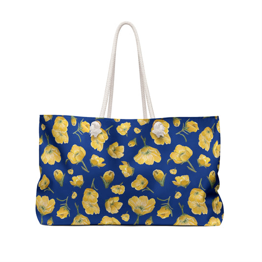 Weekender Bag, Buttercups, Dark Blue Background, Oklahoma Wildflower, Yellow Floral