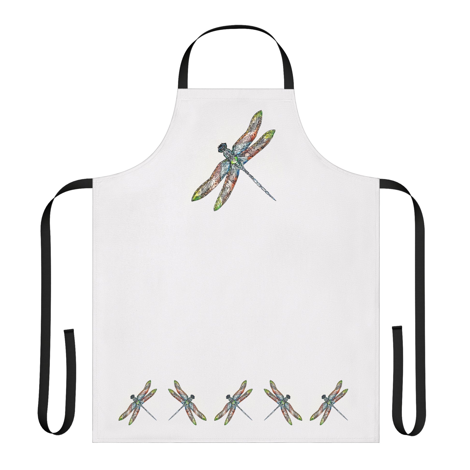 Let the home cook shine in the kitchen with a touch of character, this dragonfly chef's apron. This apron comes with a tie-back closure to fit securely, a sewn-in care label for guesswork-free maintenance, and a highly durable 100% polyester canvas construction for top-tier durability. Comes with black or white strap color, and in one size: 31.5" x 25.6".