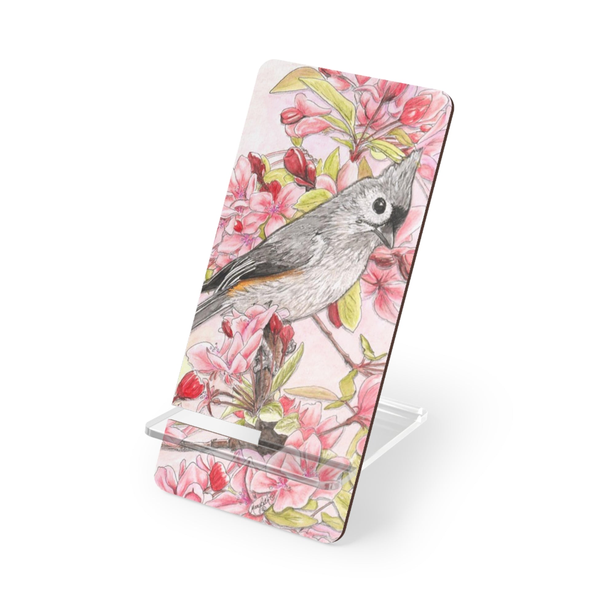 Mobile Display Stand for Smartphones, Tufted Titmouse, Wild Bird Art, Bird with Pink Floral, Cell Phone Stand