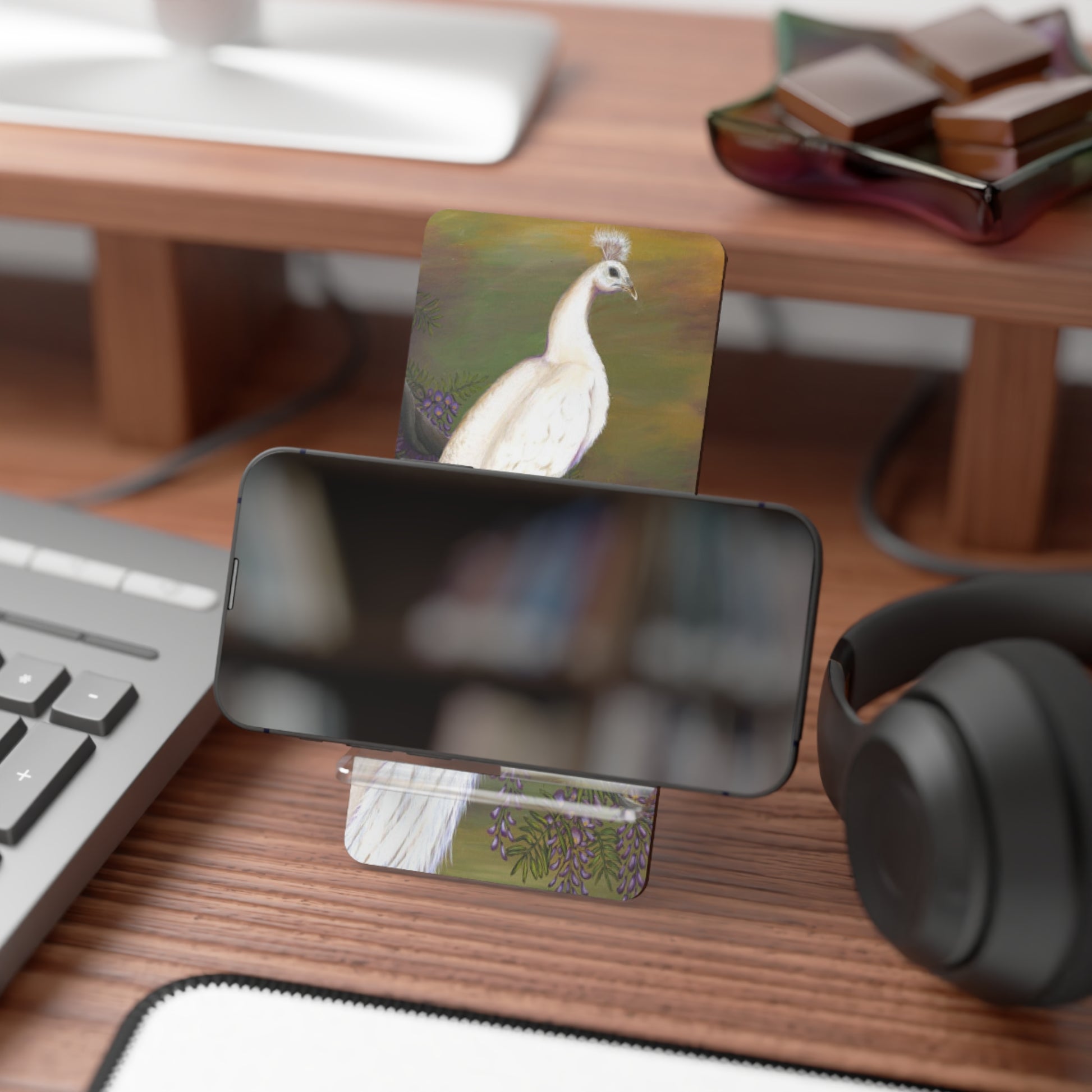 Mobile Display Stand for Smartphones, White Peacock on Purple Wisteria,