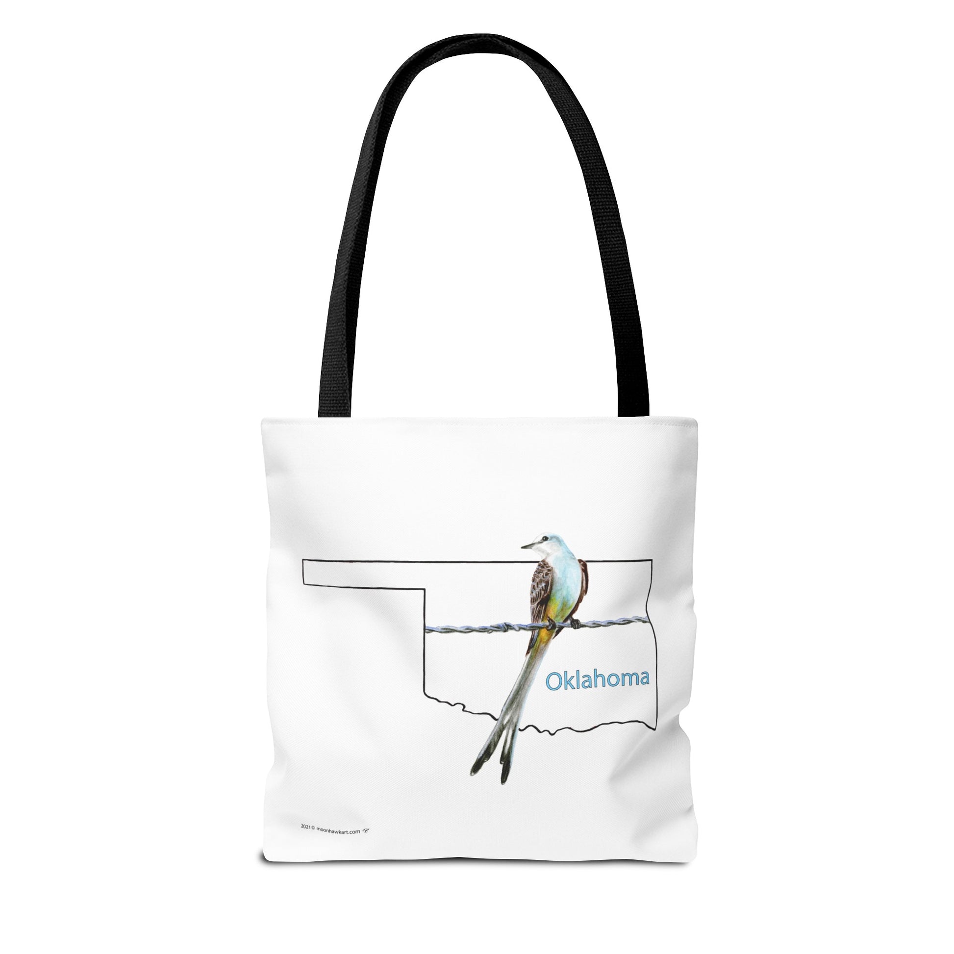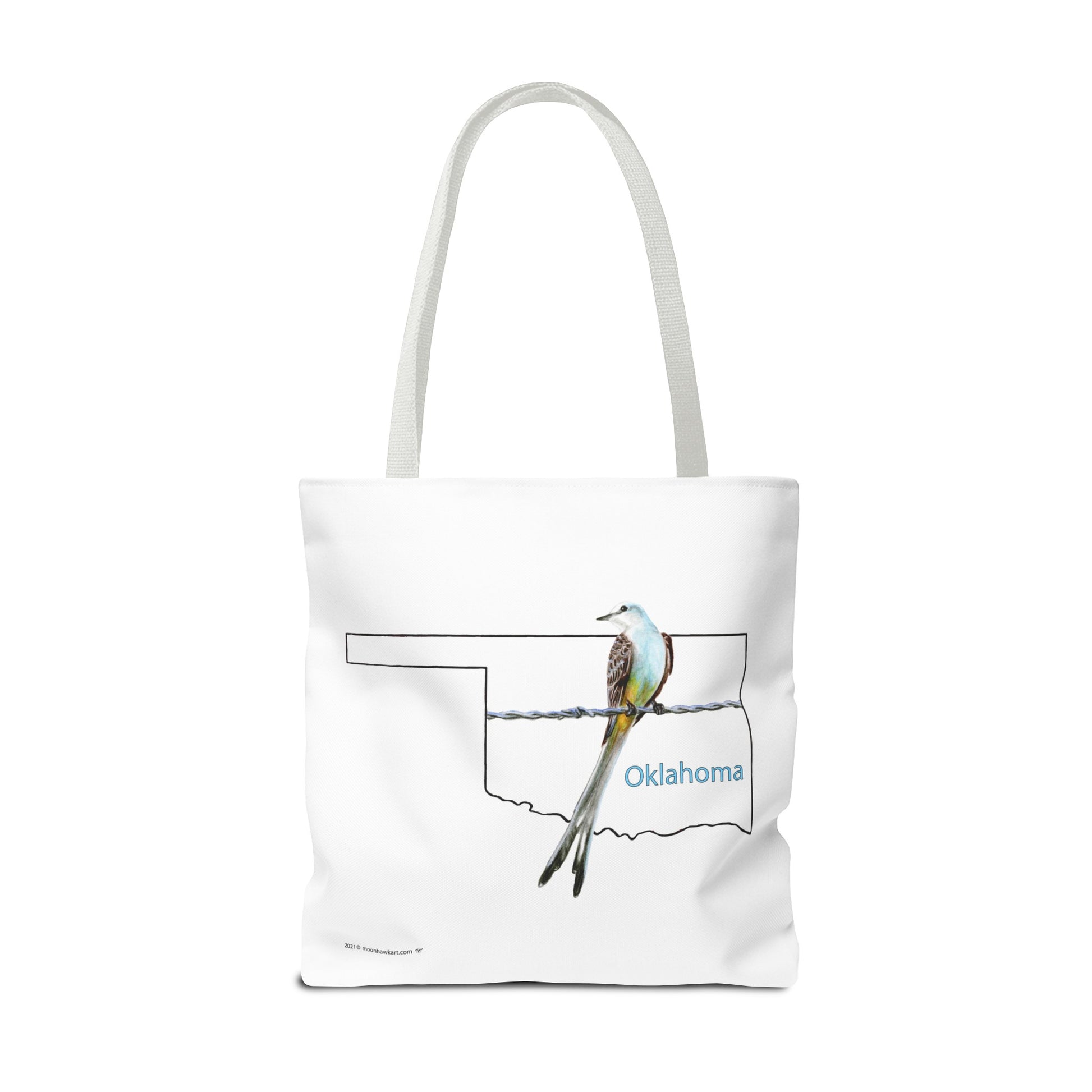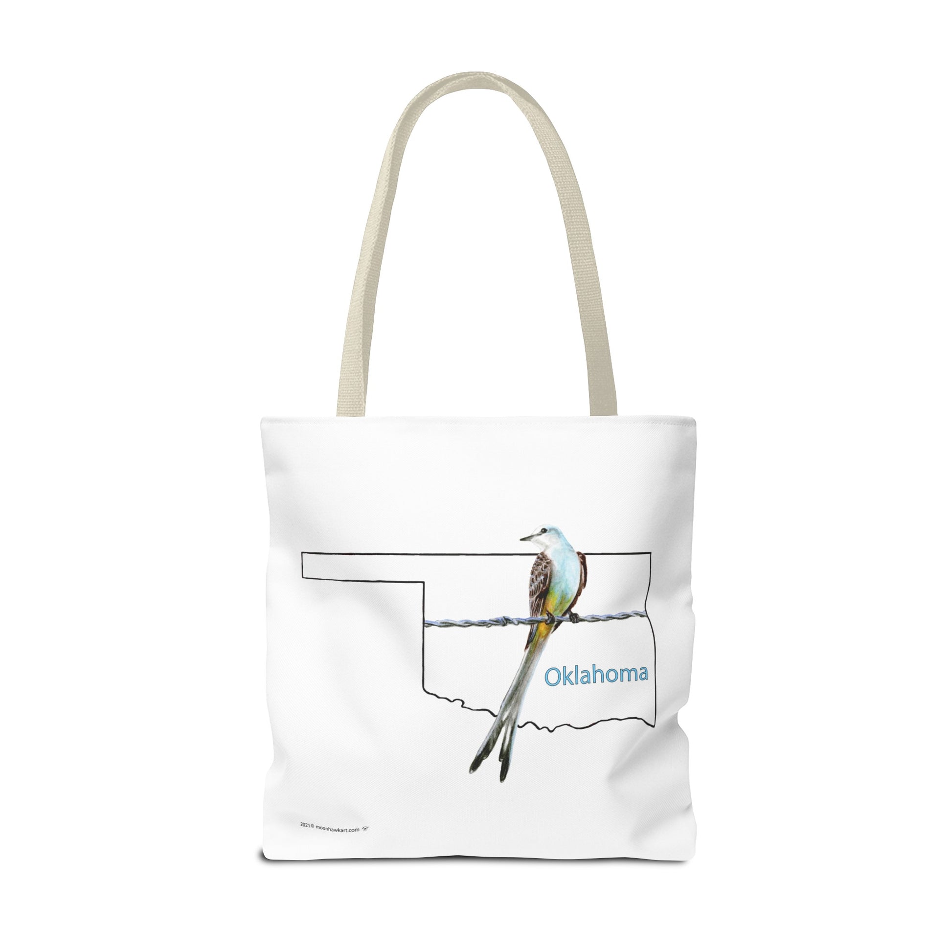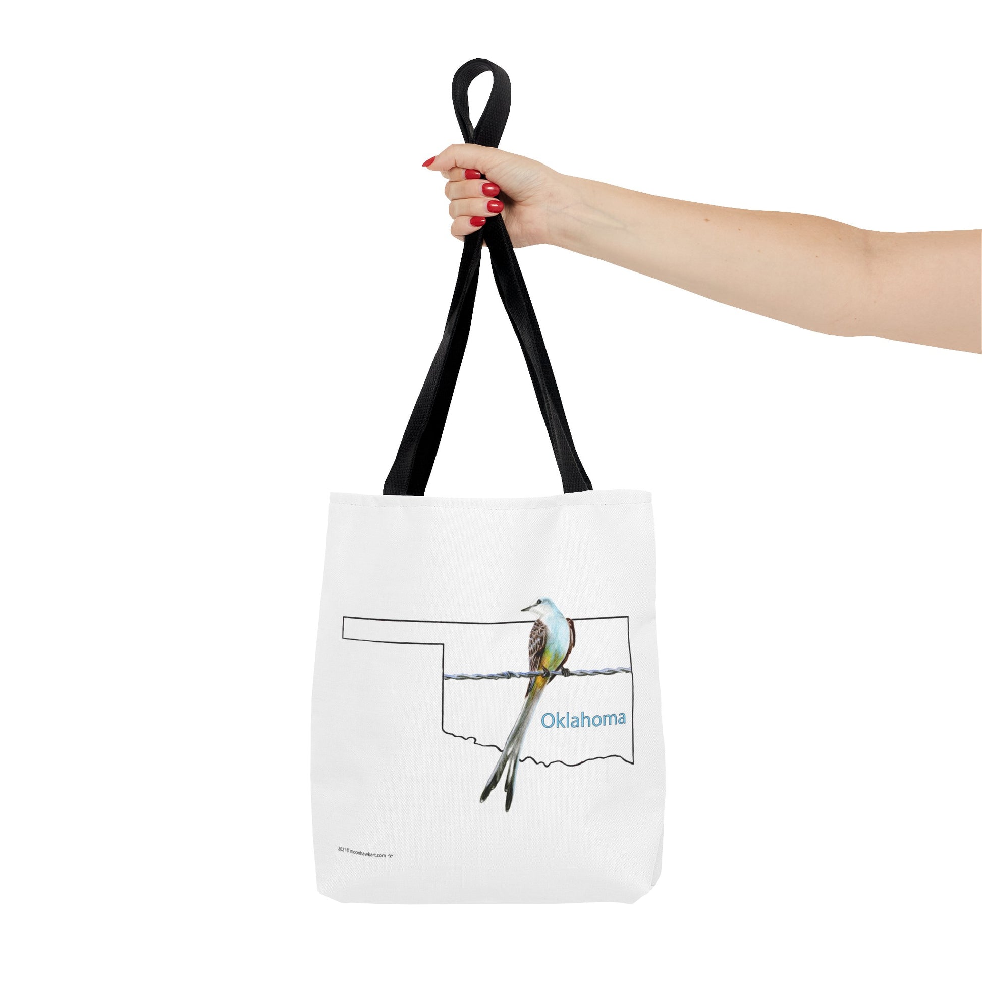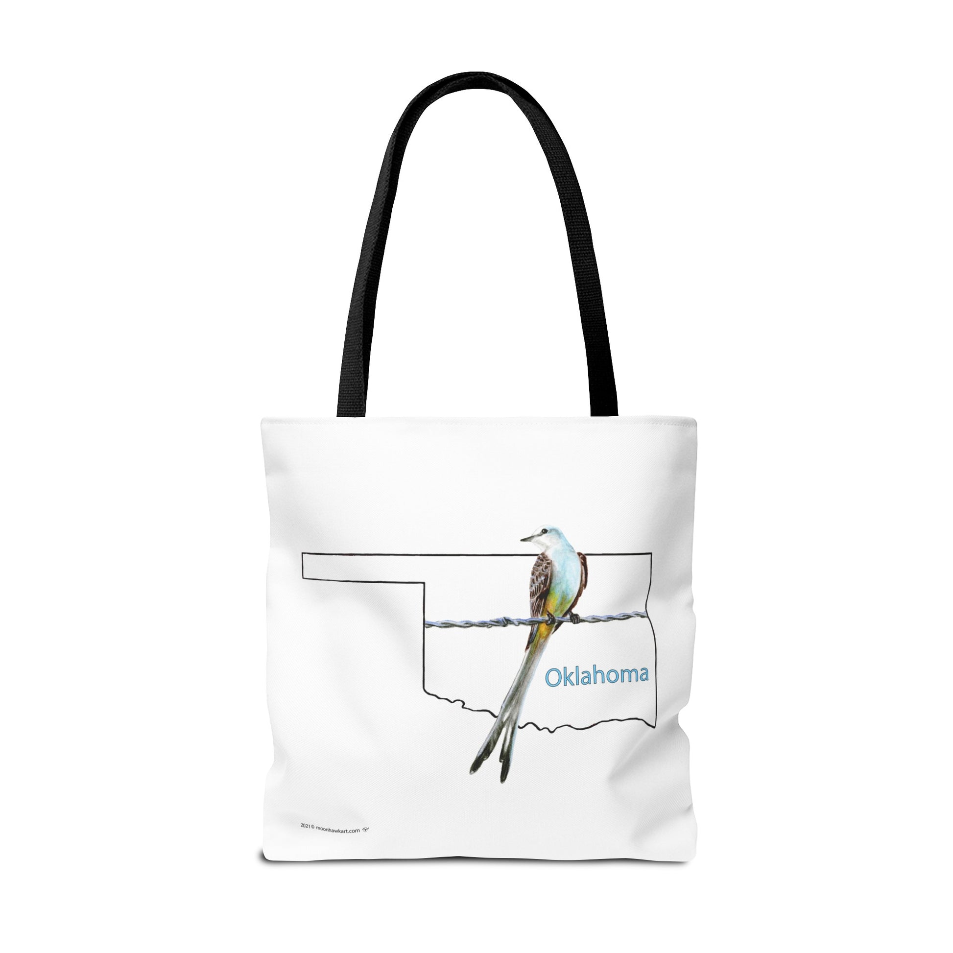 Available in 3 sizes to add both functionality and style, these Oklahoma Scissortail tote bags come with multiple handle colors to match. Made with spun polyester, these bags feature double-stitched seams, cotton webbing straps, and nonwoven laminate lining for high-end durability. Created with dye sublimation for high-end visuals.
