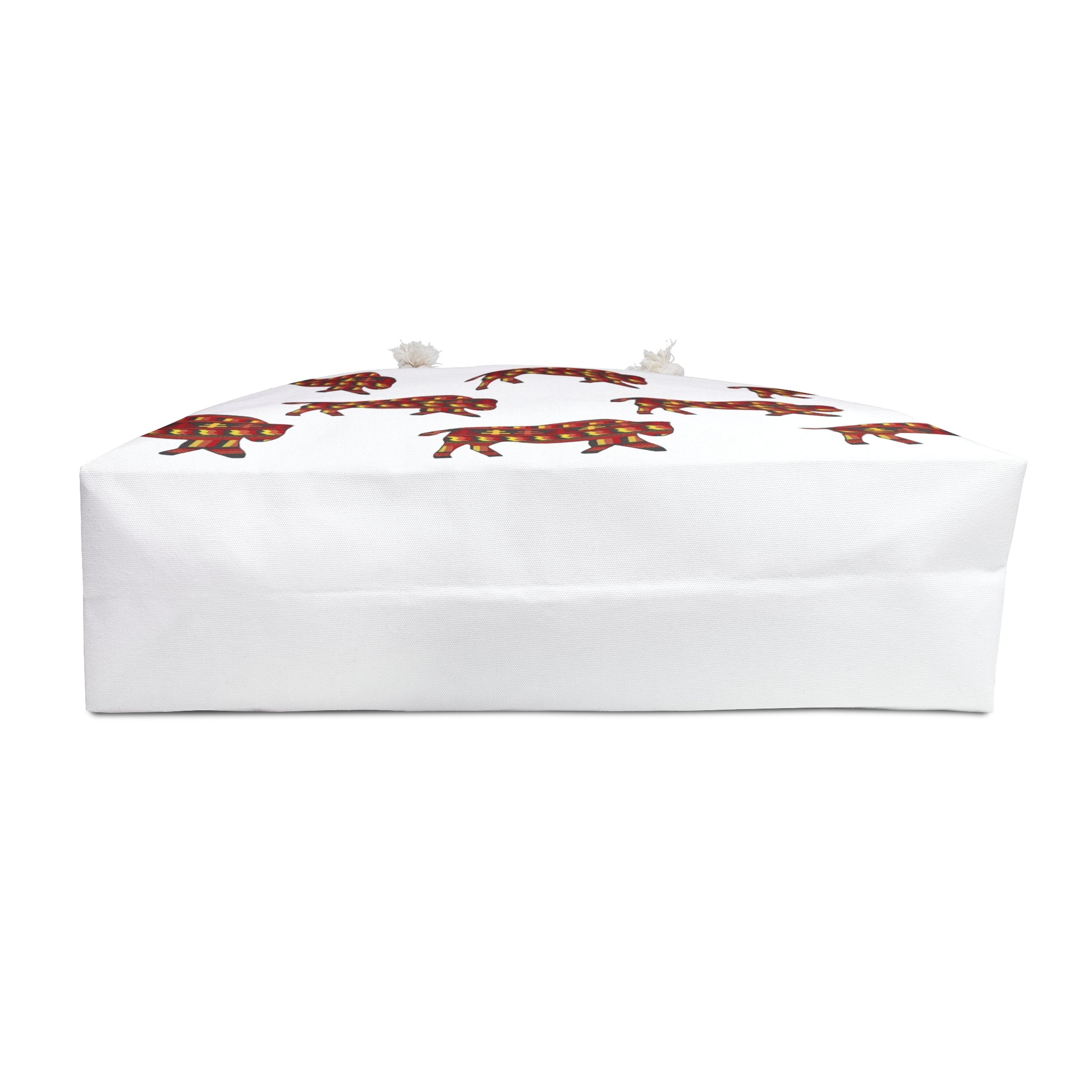 Our oversized Weekender Tote is perfect for your weekend at the beach or PowWow. The wide-mouthed, durable bag holds a generous amount of personal items and is easily held by its thick rope handles.